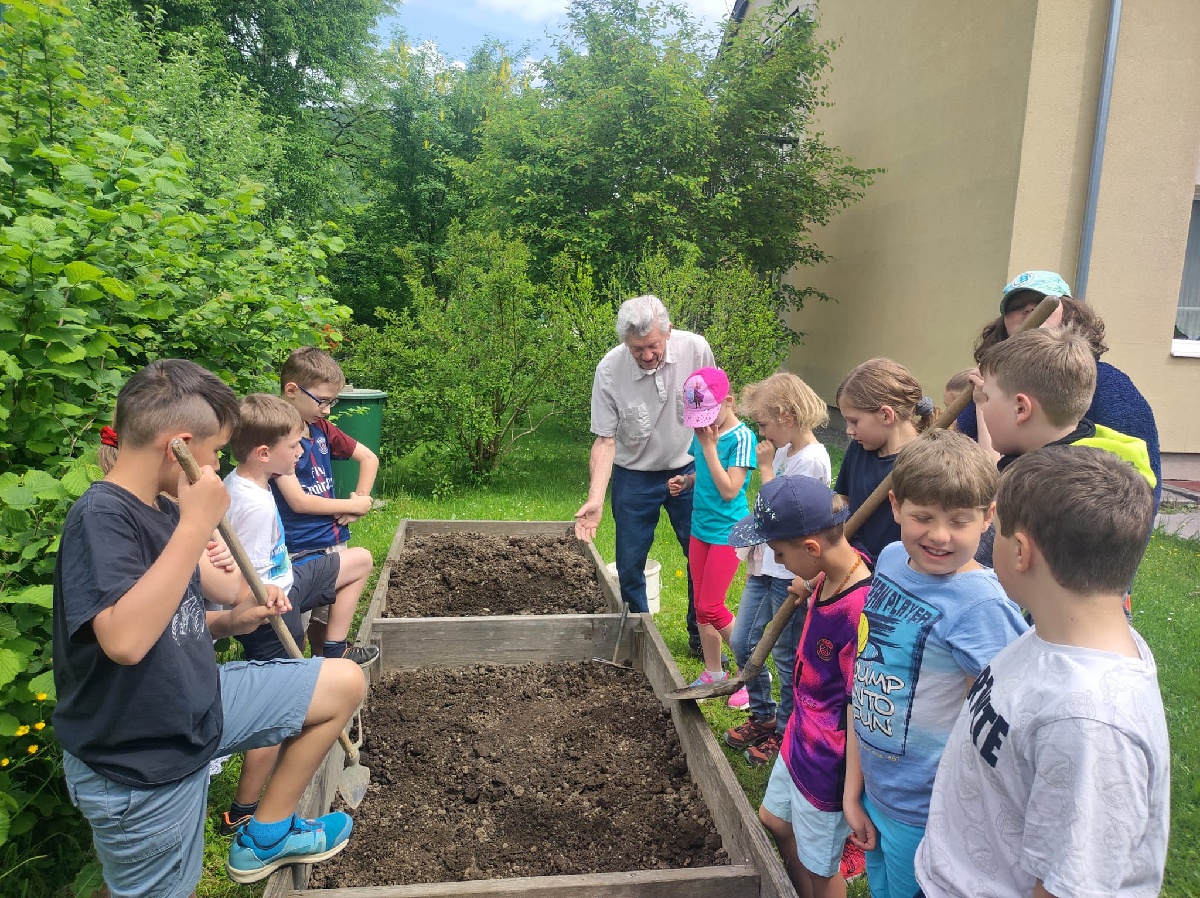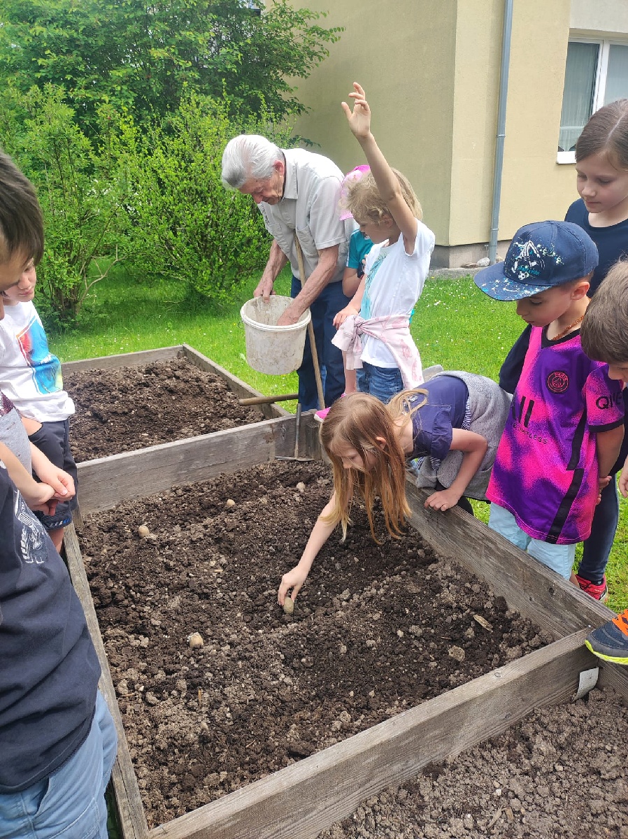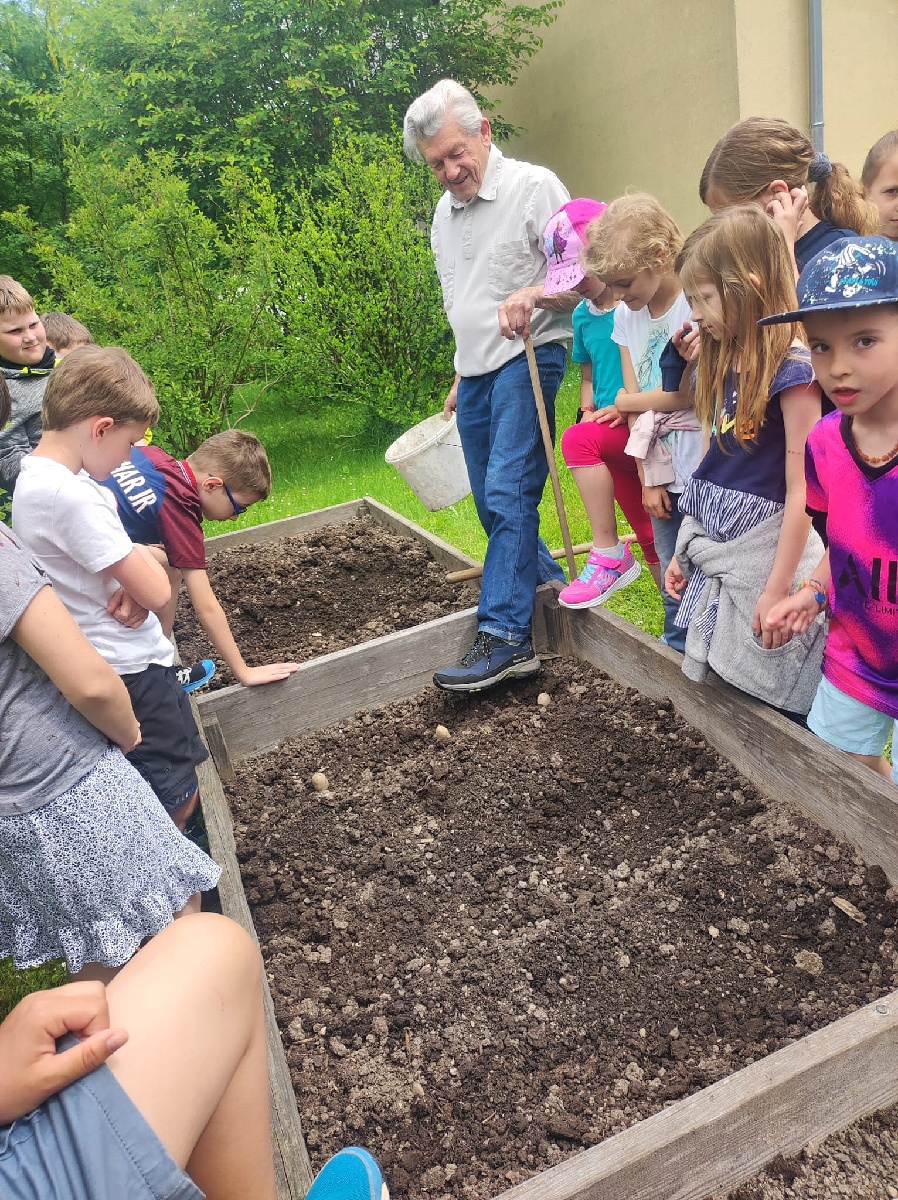 Seit Jahren besucht uns Herr Stefan Hackl von der Gesunden Gemeinde, um im Frühjahr mit den Kindern der 2. Schulstufe im schuleigenen Garten Kartoffeln und Karotten anzubauen. Monate später erfolgt mit den gleichen Kindern, die dann schon die 3. Schulstufe besuchen, die gemeinsame Ernte.