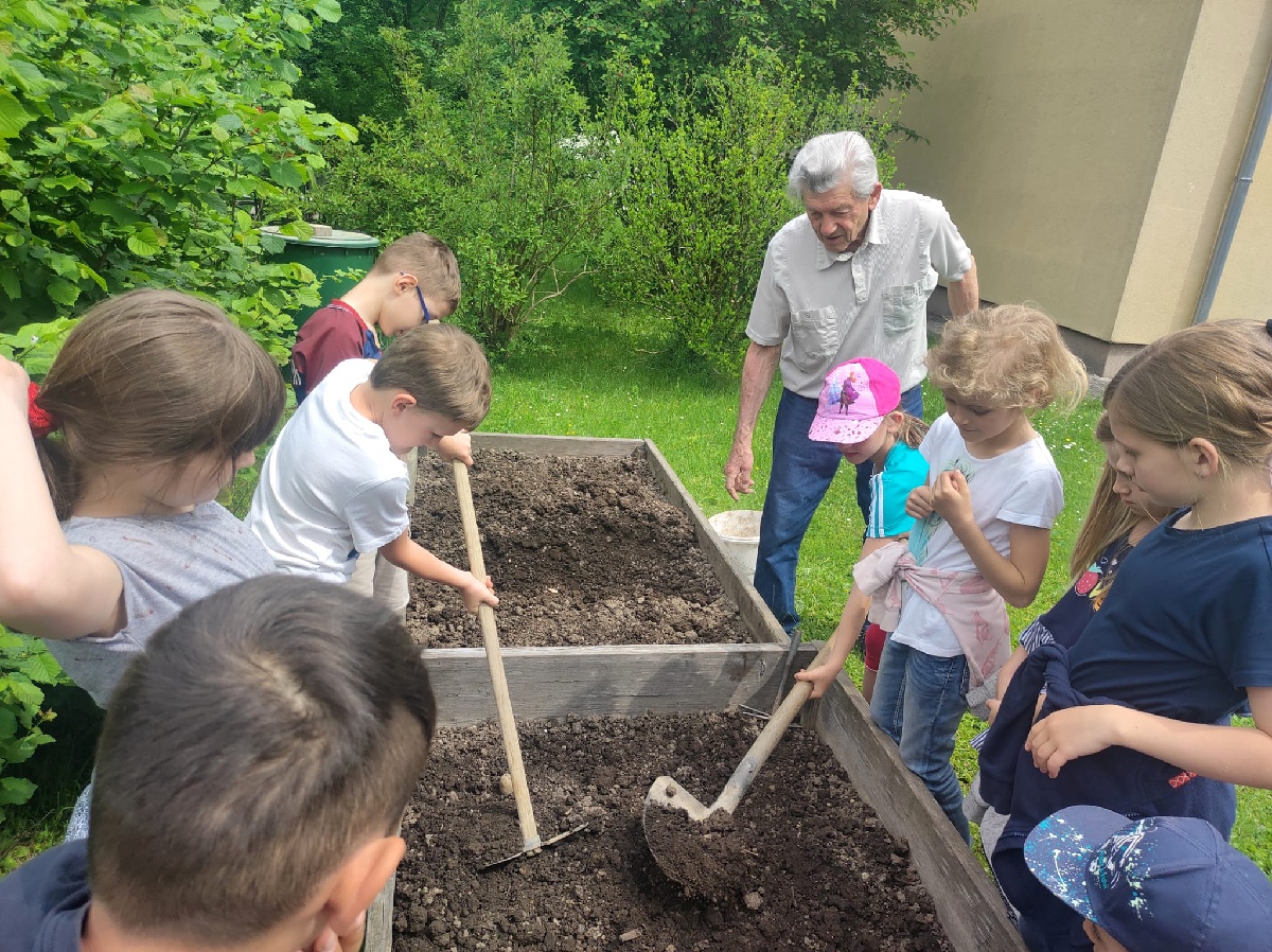 Aufgrund des unbeständigen Wetters waren die Schülerinnen und Schüler in diesem Jahr später dran, Ende Mai konnten die Kartoffeln endlich eingegraben werden. Wir warten gespannt auf den Herbst, ob auch eine gute Ernte gelingt.
