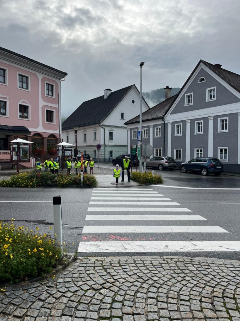Gemeinsam mit Frau Feßl spazierte die Klasse hinunter zur Gemeinde. Dort wurde beim Zebrastreifen das richtige Überqueren der Straße geübt. Herr Ofner erklärte genau, worauf Kinder im Straßenverkehr achten müssen, und alle durften das sichere Überqueren selbst ausprobieren.